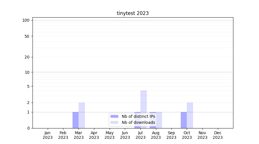 Number of downloads for experiment package tinytest, year by year, from 2025 back to 2014 (years with no downloads are omitted):