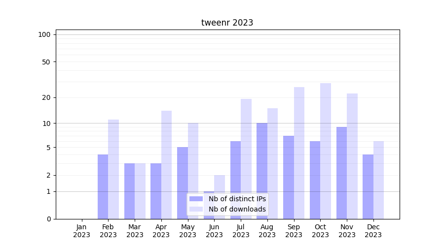 Number of downloads for experiment package tweenr, year by year, from 2025 back to 2014 (years with no downloads are omitted):