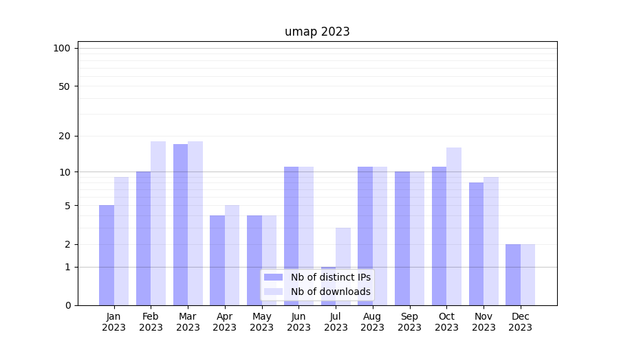 Number of downloads for experiment package umap, year by year, from 2025 back to 2014 (years with no downloads are omitted):