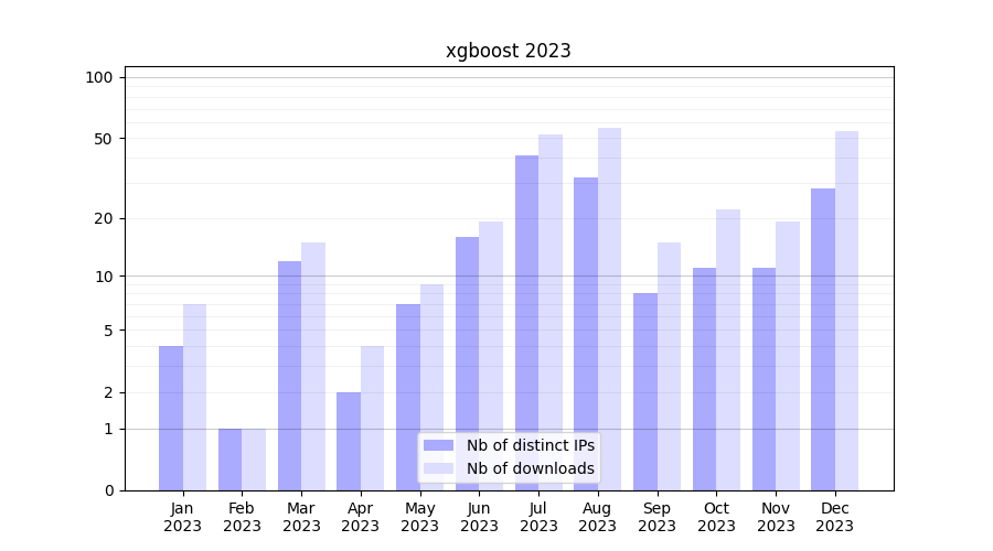 Number of downloads for experiment package xgboost, year by year, from 2025 back to 2014 (years with no downloads are omitted):