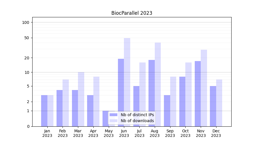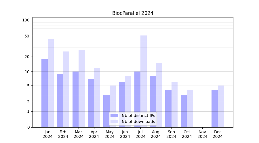 Number of downloads for workflow package BiocParallel, year by year, from 2025 back to 2015 (years with no downloads are omitted):