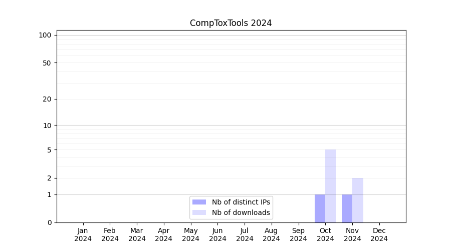Number of downloads for workflow package CompToxTools, year by year, from 2025 back to 2015 (years with no downloads are omitted):