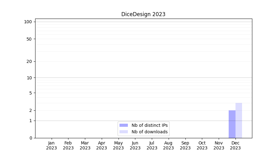 Number of downloads for workflow package DiceDesign, year by year, from 2025 back to 2015 (years with no downloads are omitted):