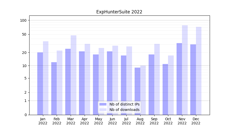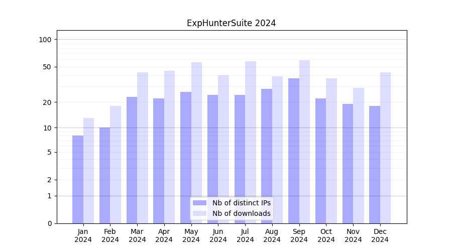 Number of downloads for workflow package ExpHunterSuite, year by year, from 2025 back to 2015 (years with no downloads are omitted):