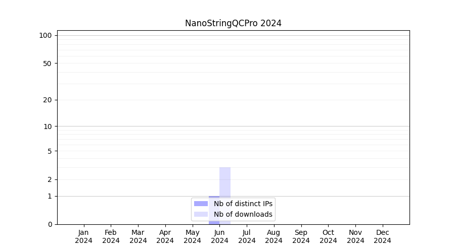 Number of downloads for workflow package NanoStringQCPro, year by year, from 2025 back to 2015 (years with no downloads are omitted):