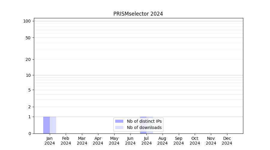 Number of downloads for workflow package PRISMselector, year by year, from 2025 back to 2015 (years with no downloads are omitted):