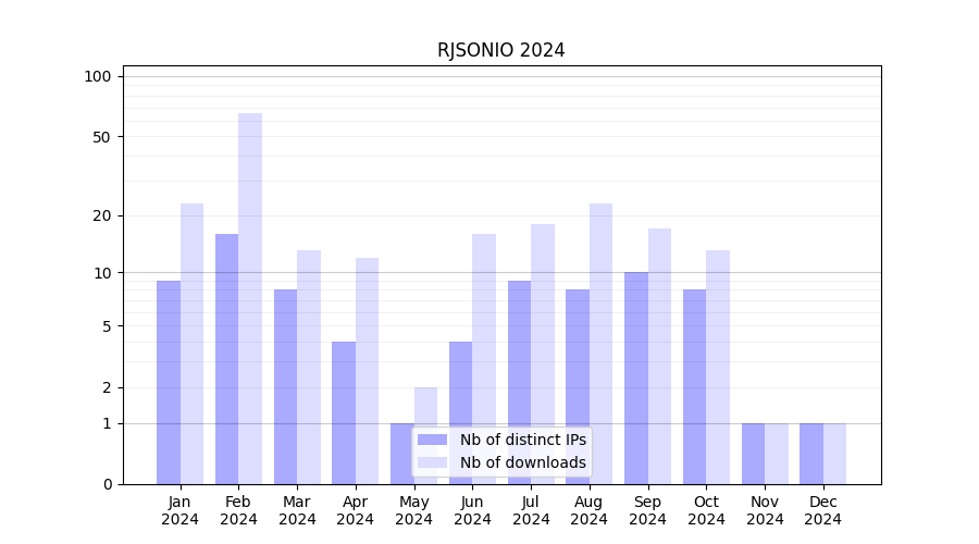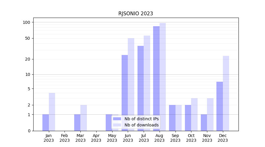 Number of downloads for workflow package RJSONIO, year by year, from 2025 back to 2015 (years with no downloads are omitted):