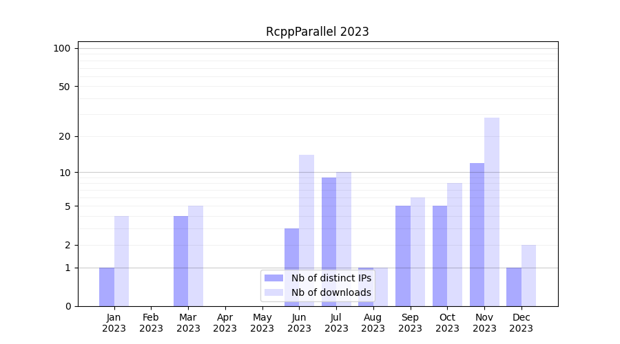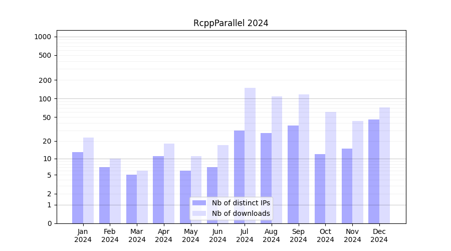 Number of downloads for workflow package RcppParallel, year by year, from 2025 back to 2015 (years with no downloads are omitted):