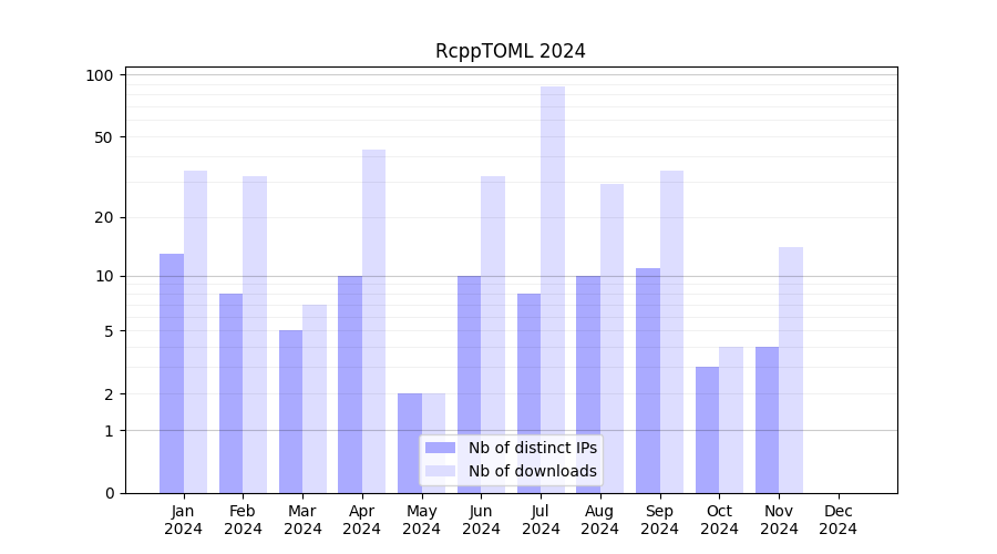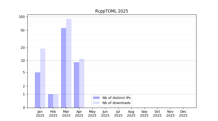 Number of downloads for workflow package RcppTOML, year by year, from 2025 back to 2015 (years with no downloads are omitted):