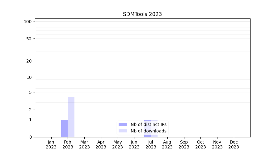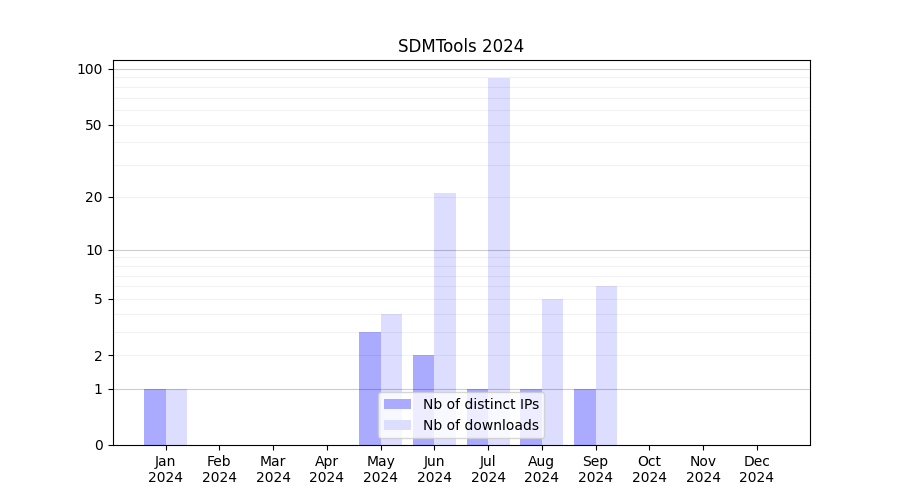 Number of downloads for workflow package SDMTools, year by year, from 2025 back to 2015 (years with no downloads are omitted):