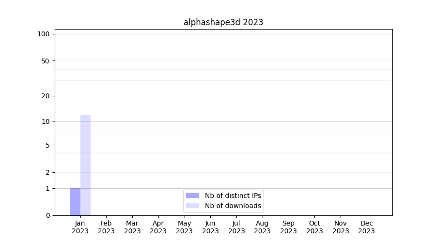 Number of downloads for workflow package alphashape3d, year by year, from 2025 back to 2015 (years with no downloads are omitted):