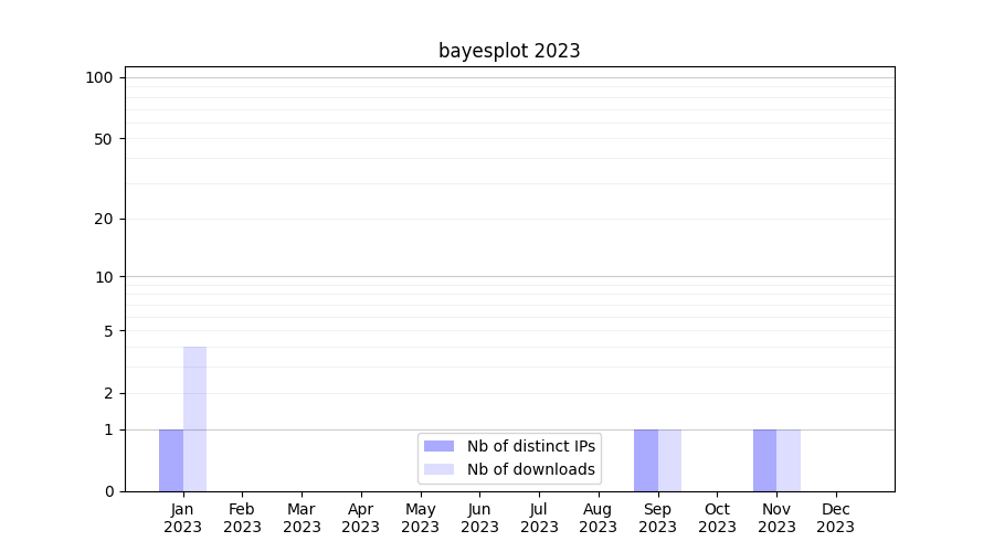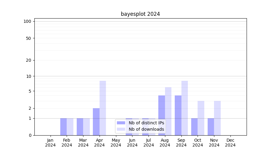 Number of downloads for workflow package bayesplot, year by year, from 2025 back to 2015 (years with no downloads are omitted):