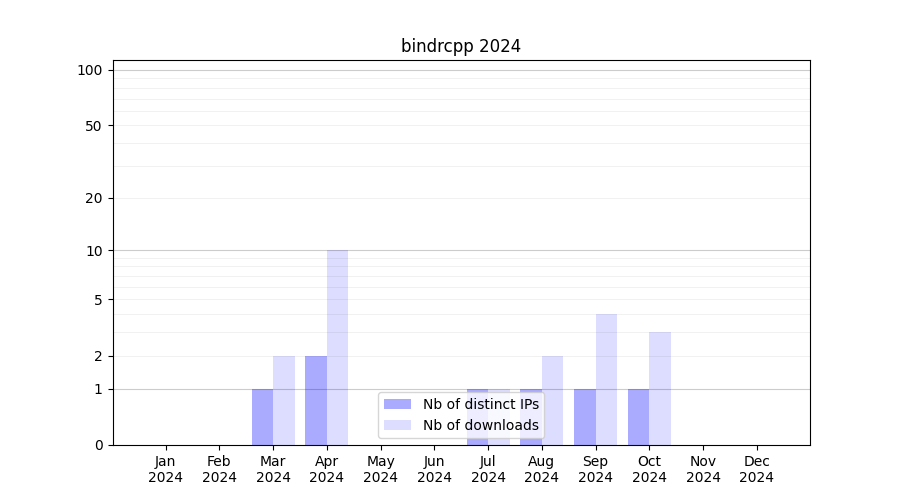 Number of downloads for workflow package bindrcpp, year by year, from 2025 back to 2015 (years with no downloads are omitted):