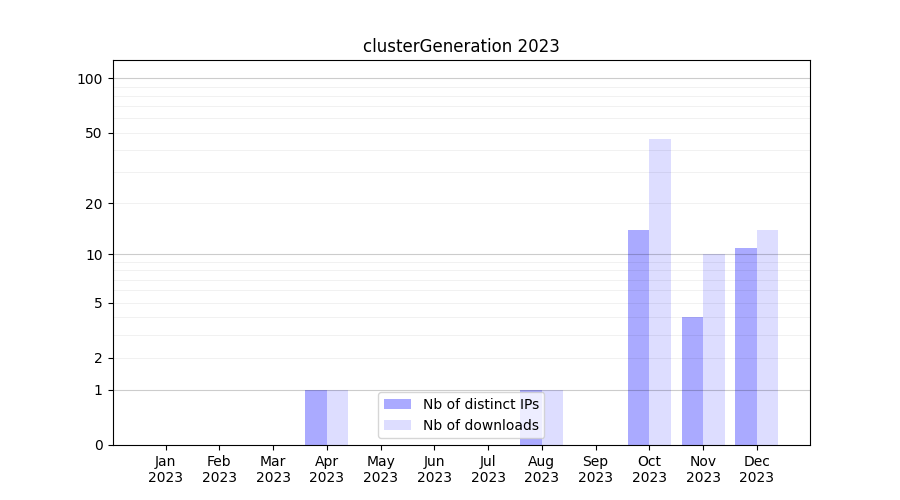 Number of downloads for workflow package clusterGeneration, year by year, from 2025 back to 2015 (years with no downloads are omitted):