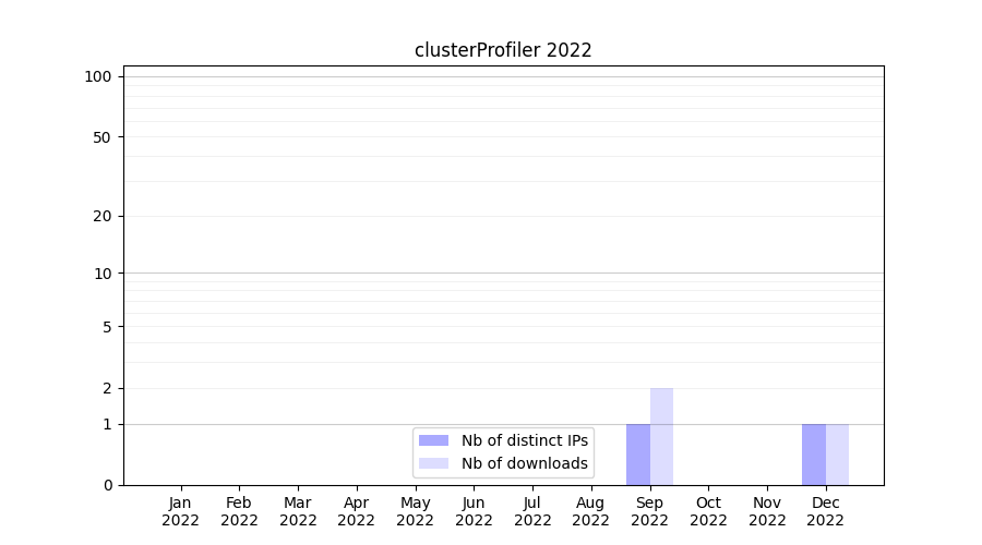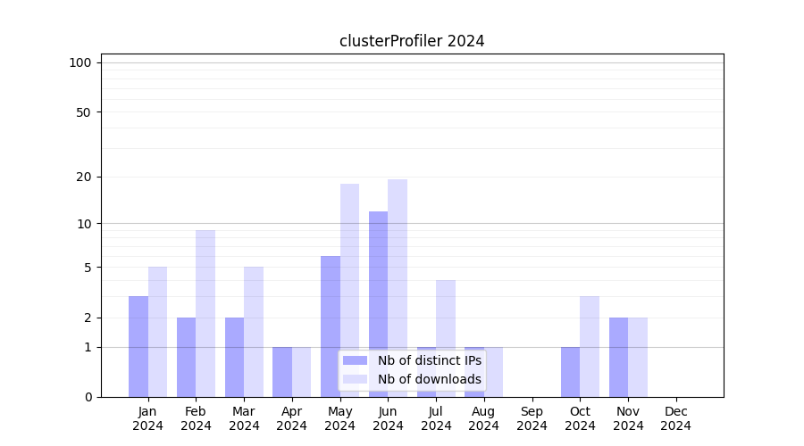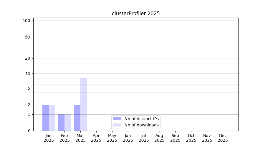 Number of downloads for workflow package clusterProfiler, year by year, from 2025 back to 2015 (years with no downloads are omitted):