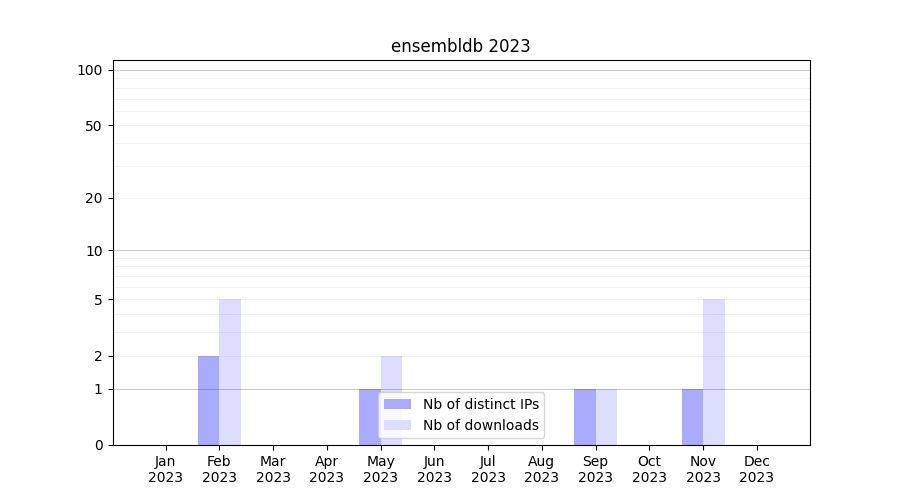 Number of downloads for workflow package ensembldb, year by year, from 2025 back to 2015 (years with no downloads are omitted):