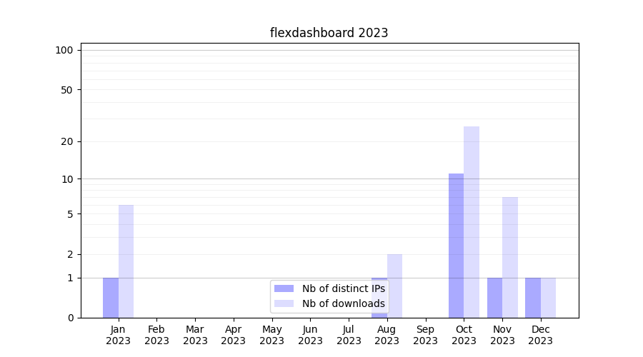 Number of downloads for workflow package flexdashboard, year by year, from 2025 back to 2015 (years with no downloads are omitted):
