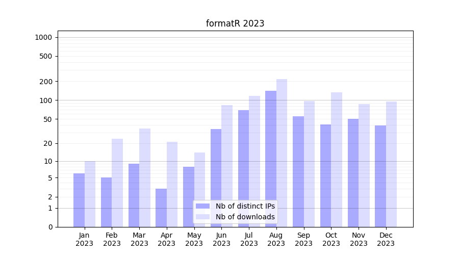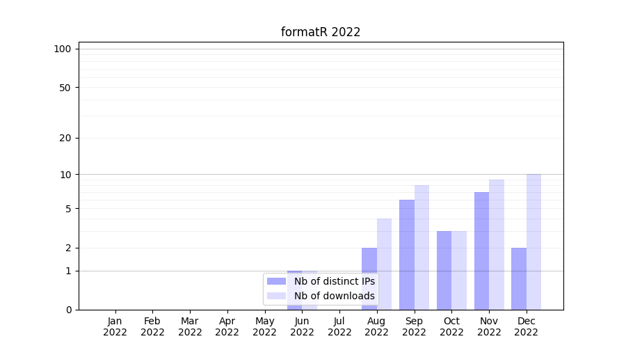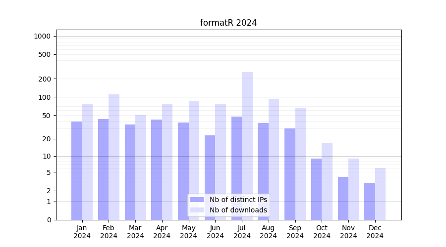 Number of downloads for workflow package formatR, year by year, from 2025 back to 2015 (years with no downloads are omitted):