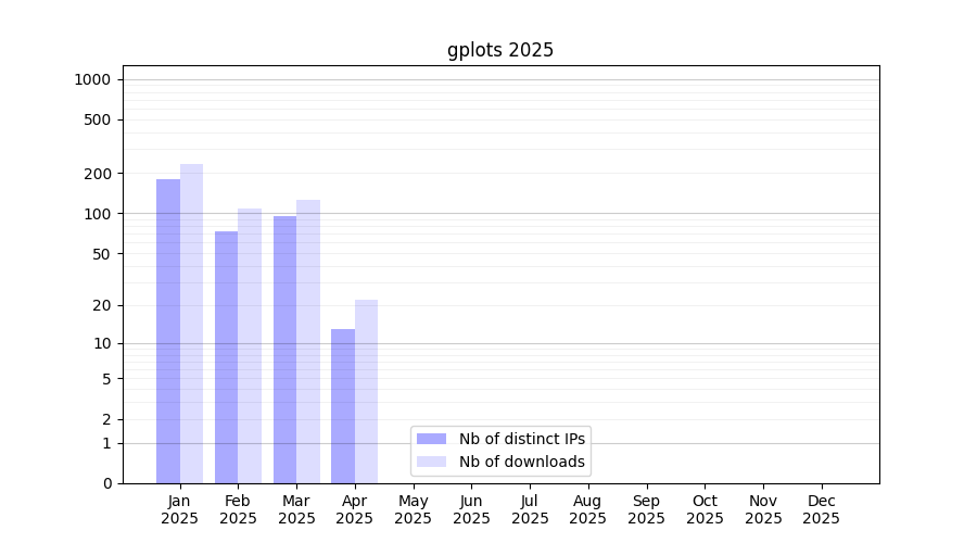 Number of downloads for workflow package gplots, year by year, from 2025 back to 2015 (years with no downloads are omitted):