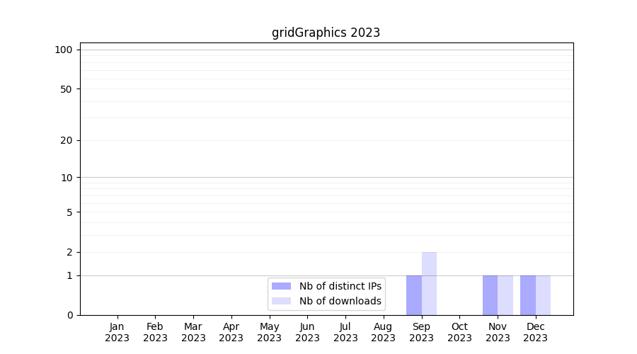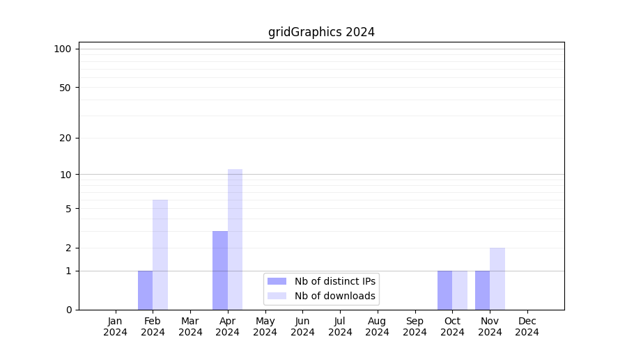 Number of downloads for workflow package gridGraphics, year by year, from 2025 back to 2015 (years with no downloads are omitted):