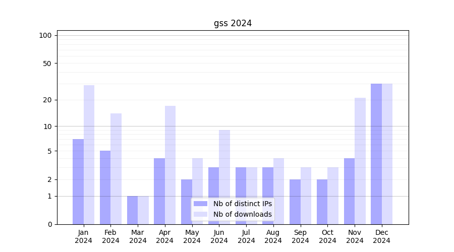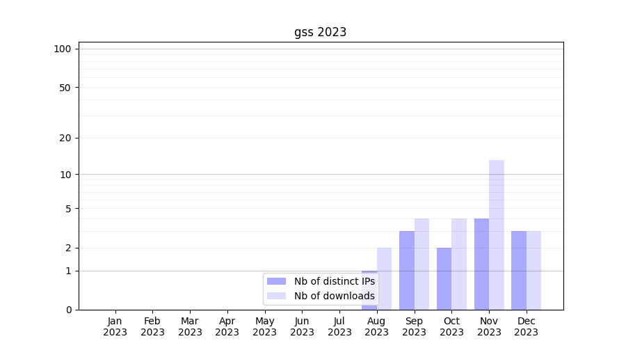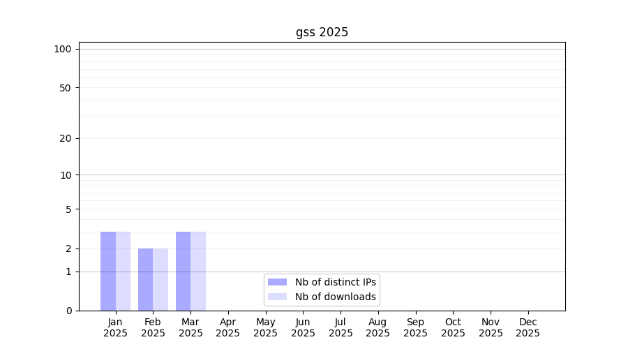 Number of downloads for workflow package gss, year by year, from 2025 back to 2015 (years with no downloads are omitted):