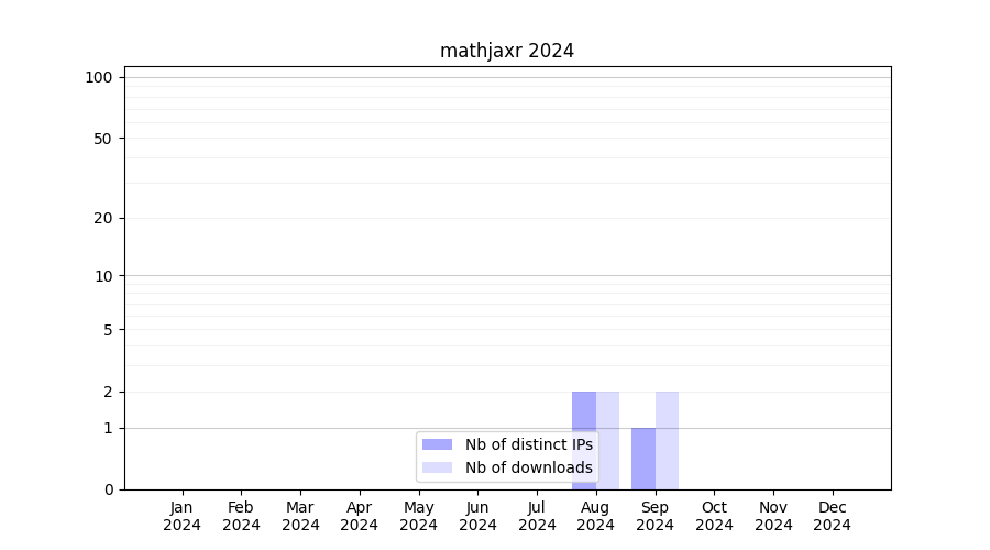 Number of downloads for workflow package mathjaxr, year by year, from 2025 back to 2015 (years with no downloads are omitted):