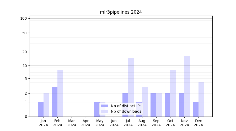 Number of downloads for workflow package mlr3pipelines, year by year, from 2025 back to 2015 (years with no downloads are omitted):