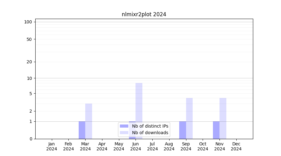 Number of downloads for workflow package nlmixr2plot, year by year, from 2025 back to 2015 (years with no downloads are omitted):