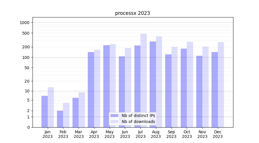 Number of downloads for workflow package processx, year by year, from 2025 back to 2015 (years with no downloads are omitted):