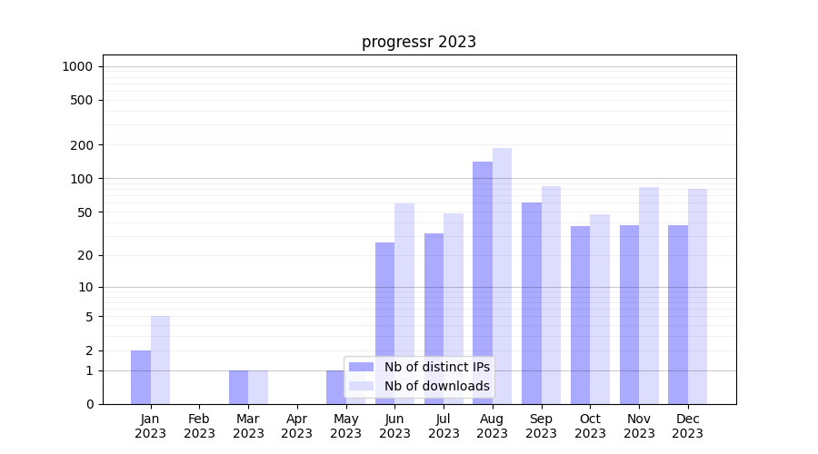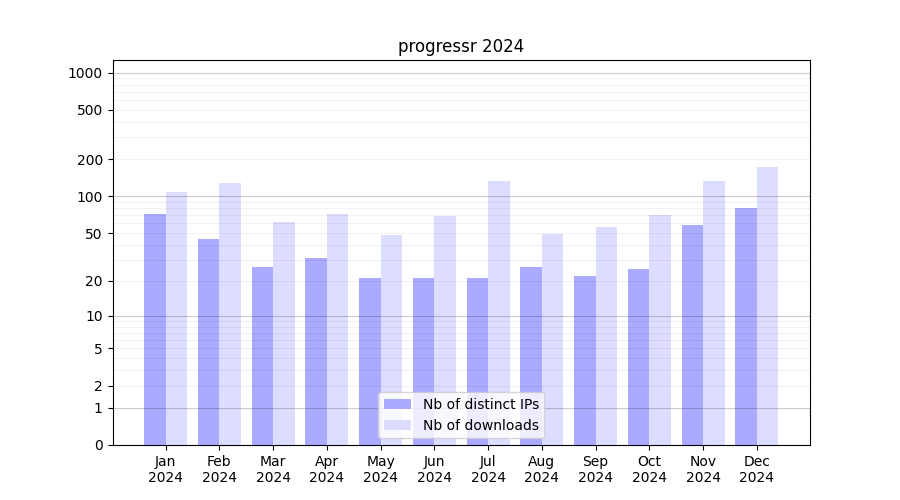 Number of downloads for workflow package progressr, year by year, from 2025 back to 2015 (years with no downloads are omitted):