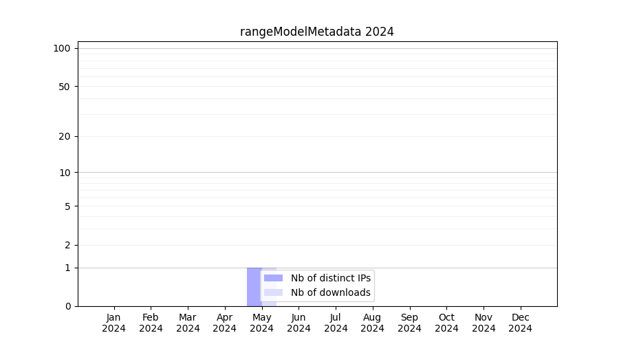 Number of downloads for workflow package rangeModelMetadata, year by year, from 2025 back to 2015 (years with no downloads are omitted):