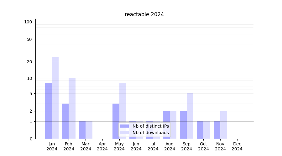 Number of downloads for workflow package reactable, year by year, from 2025 back to 2015 (years with no downloads are omitted):