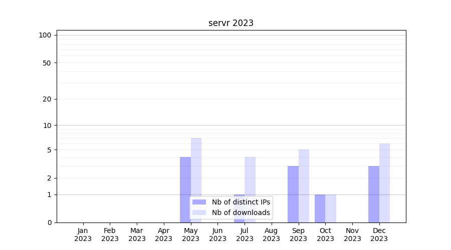 Number of downloads for workflow package servr, year by year, from 2025 back to 2015 (years with no downloads are omitted):