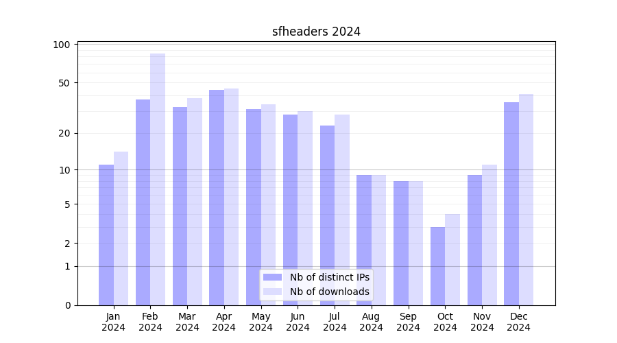 Number of downloads for workflow package sfheaders, year by year, from 2025 back to 2015 (years with no downloads are omitted):
