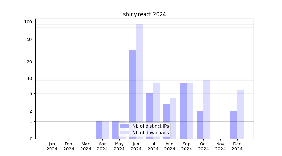 Number of downloads for workflow package shiny.react, year by year, from 2025 back to 2015 (years with no downloads are omitted):
