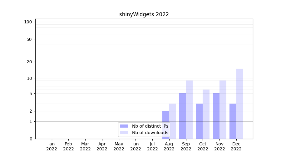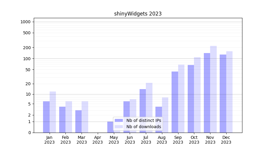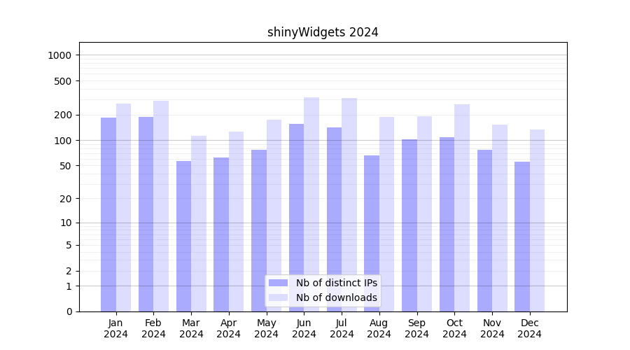 Number of downloads for workflow package shinyWidgets, year by year, from 2025 back to 2015 (years with no downloads are omitted):