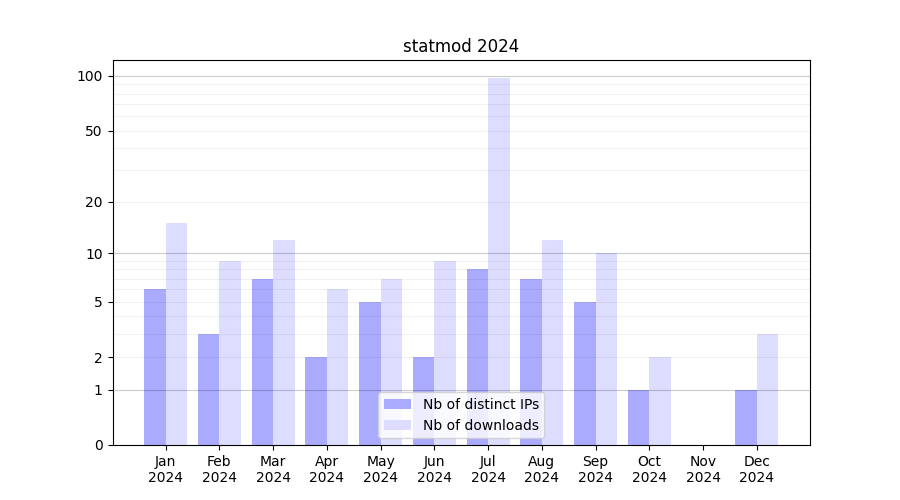 Number of downloads for workflow package statmod, year by year, from 2025 back to 2015 (years with no downloads are omitted):
