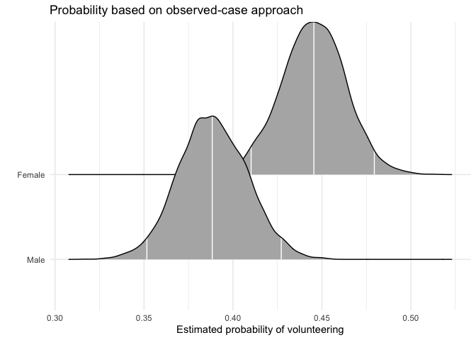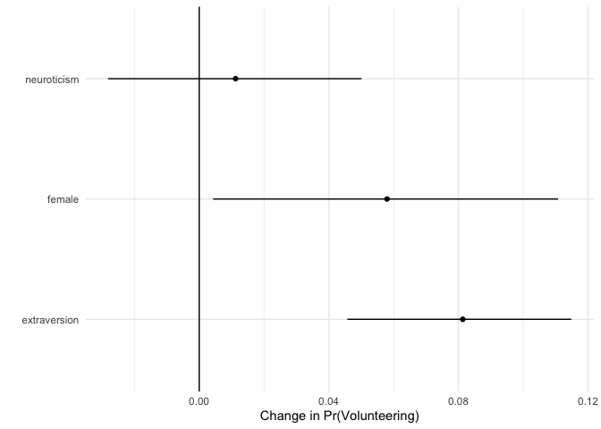 \[ \text{Pr}\left(\text{Volunteering}_i\right) = \text{logit}^{-1}\left(\beta_1 + \beta_2 \text{Female}_i + \beta_3 \text{Neuroticism}_i + \beta_4 \text{Extraversion}_i\right) \]