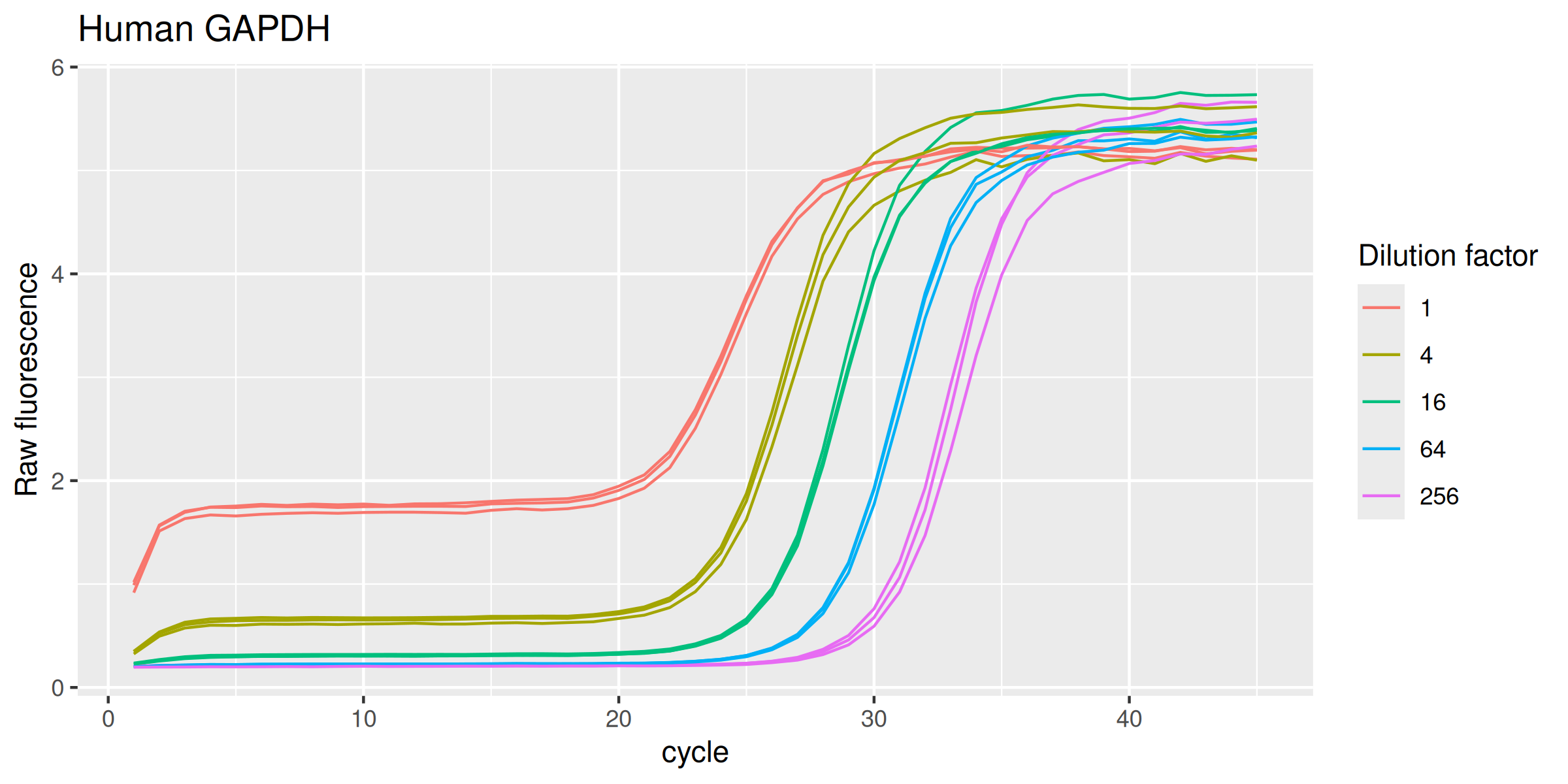 labs(y = "Raw fluorescence", colour = "Dilution factor", title = "Human GAPDH") +