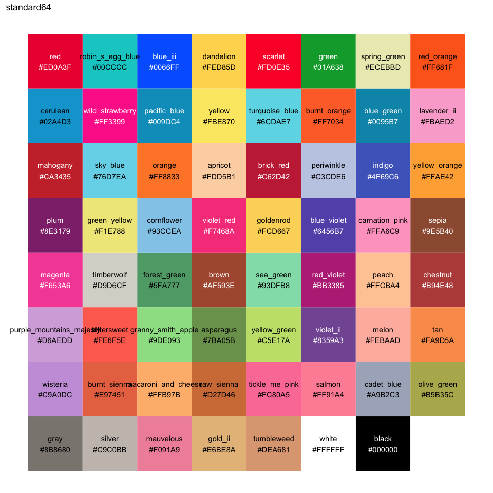 crayons provides crayon-based color palettes. For nostalgic uses, consider combining with ggrough or roughsf.
