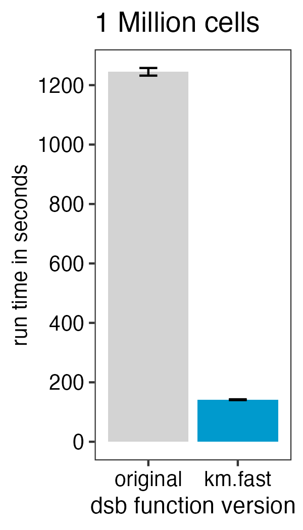 To speed up the function 10-fold with minimal impact on the results from those in the default function set fast.km = TRUE with either the DSBNormalizeProtein or ModelNegativeADTnorm functions. See the new vignette on this topic.