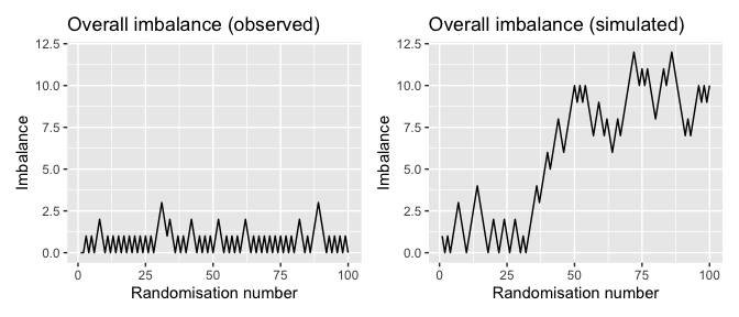 Under some scenarios (e.g. minimization), it can be helpful to monitor the imbalance of the randomisation process. randotools includes some tools to assist with this, specifically in terms of comparing observed imbalance with what might be observed with simple random allocation.