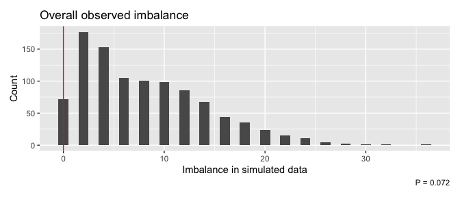 imbalance_test compares the observed imbalance with random allocation, providing a p-value, which can then be plotted to inspect the observed (the red line) and simulated imbalances (the bars):