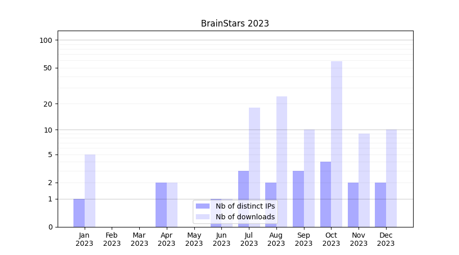 Number of downloads for software package BrainStars, year by year, from 2025 back to 2014 (years with no downloads are omitted):