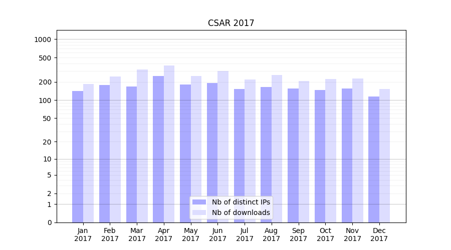 Number of downloads for software package CSAR, year by year, from 2025 back to 2014 (years with no downloads are omitted):