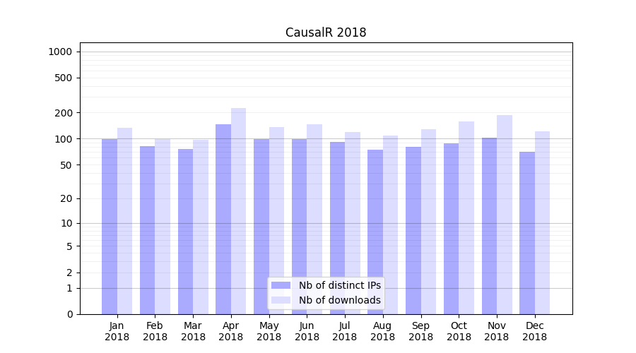 Number of downloads for software package CausalR, year by year, from 2025 back to 2014 (years with no downloads are omitted):