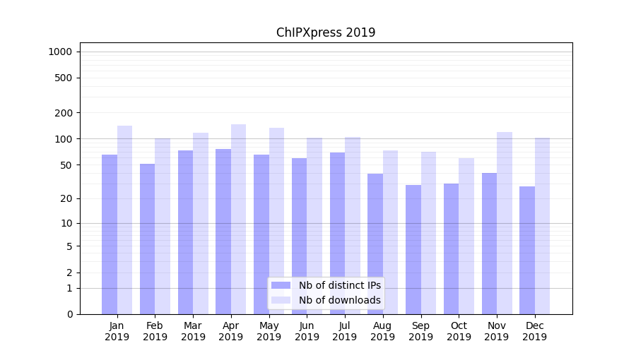 Number of downloads for software package ChIPXpress, year by year, from 2025 back to 2014 (years with no downloads are omitted):