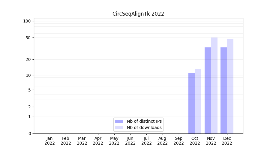 Number of downloads for software package CircSeqAlignTk, year by year, from 2025 back to 2014 (years with no downloads are omitted):