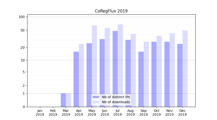 Number of downloads for software package CoRegFlux, year by year, from 2025 back to 2014 (years with no downloads are omitted):