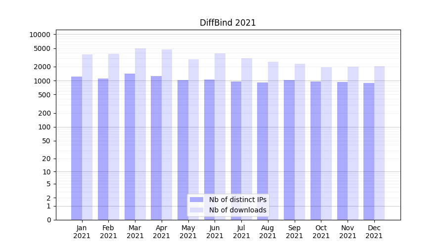 Number of downloads for software package DiffBind, year by year, from 2025 back to 2014 (years with no downloads are omitted):
